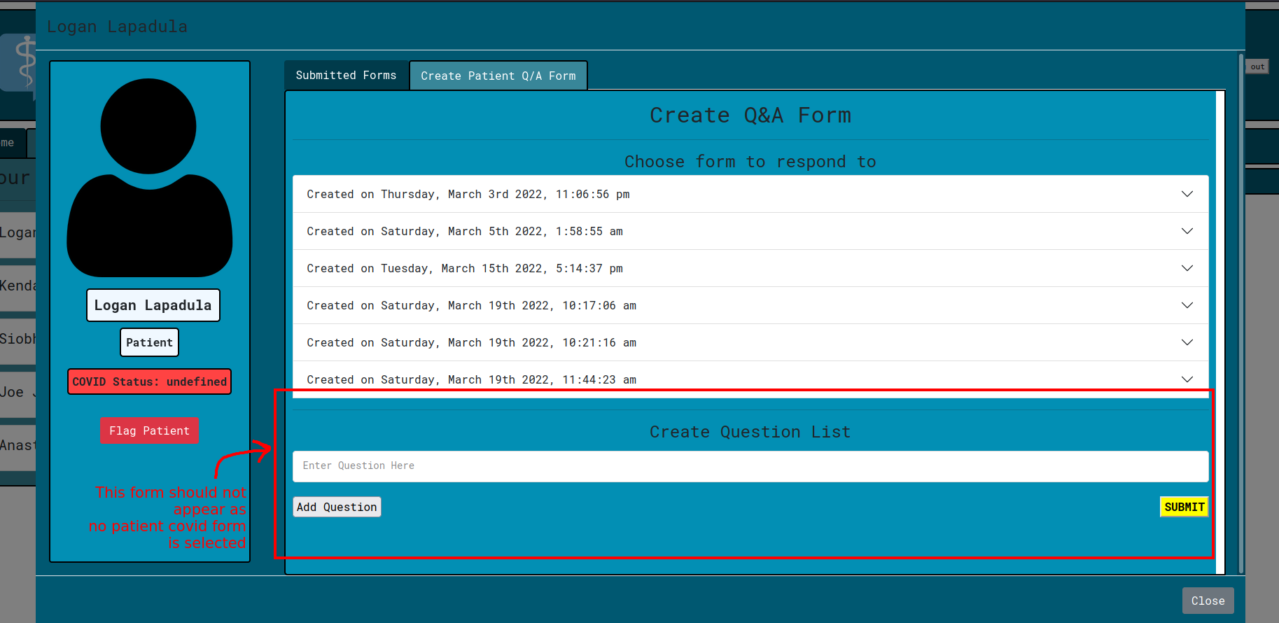 Bug - Doctor question list form should not appear if a patient covid form is not selected #80