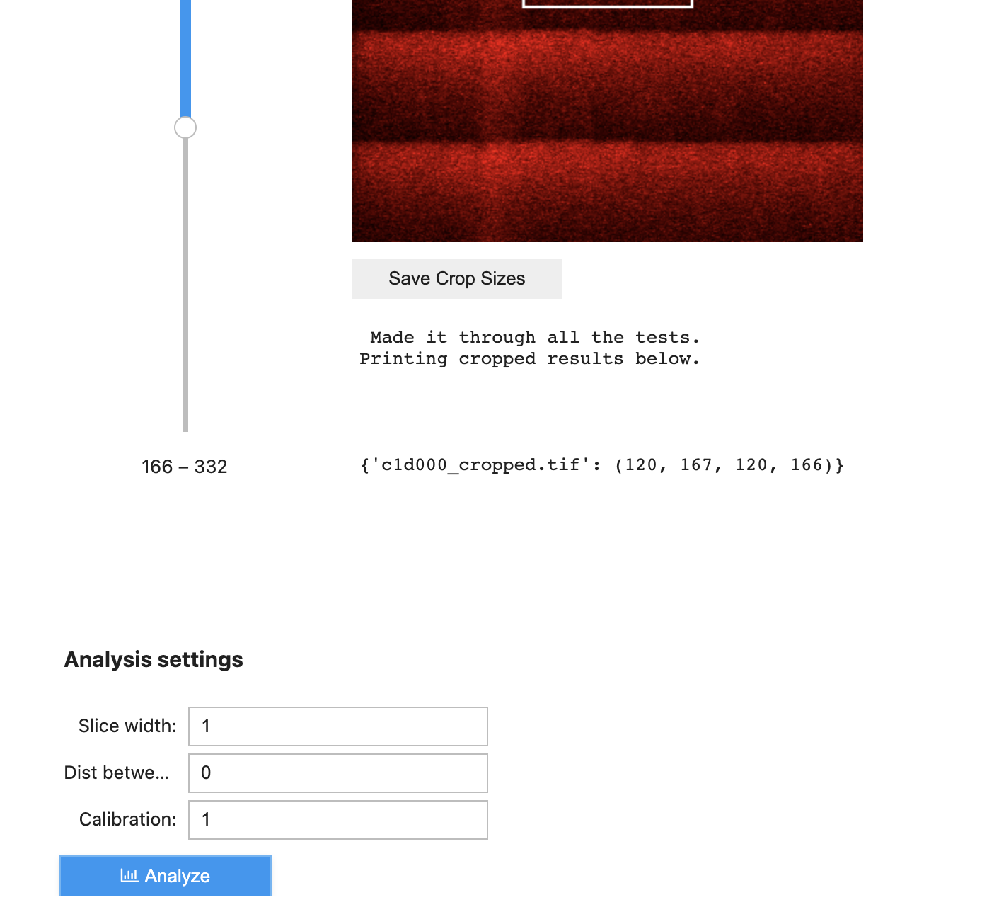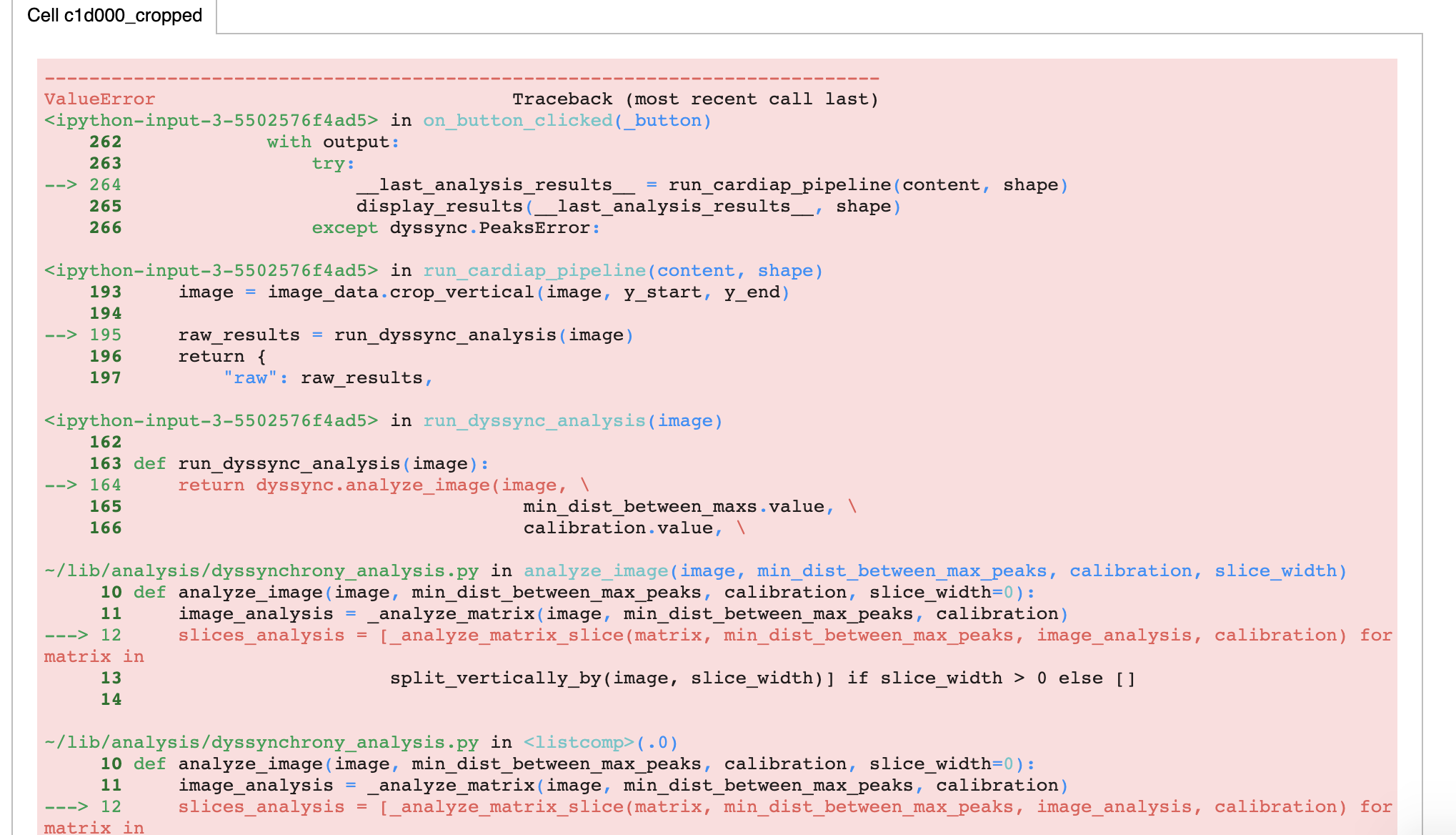 Hi! Thanks for developing this tool. I currently use a custom-built Matlab code to generate my calcium imaging metrics, but I thought I'd try your tool to see if it's more user-friendly for people learning how to generate this data. I downloaded your example image, uploaded it onto the http://cardiap.herokuapp.com/ site, cropped it to the presets, and clicked analyze with the preset analysis settings and received an error (see images below). If I could get some feedback on this, that would be excellent!