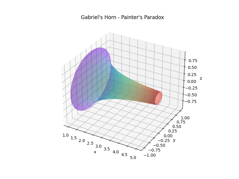print(f"The surface area of Gabriel's Horn is: {surface_area}")The paradox of Gabriel's Horn arises from these calculations: a geometric figure with finite volume has an infinite surface area. This paradox challenges our intuition about physical reality and the nature of infinity, themes we will explore in the next sections of this paper.