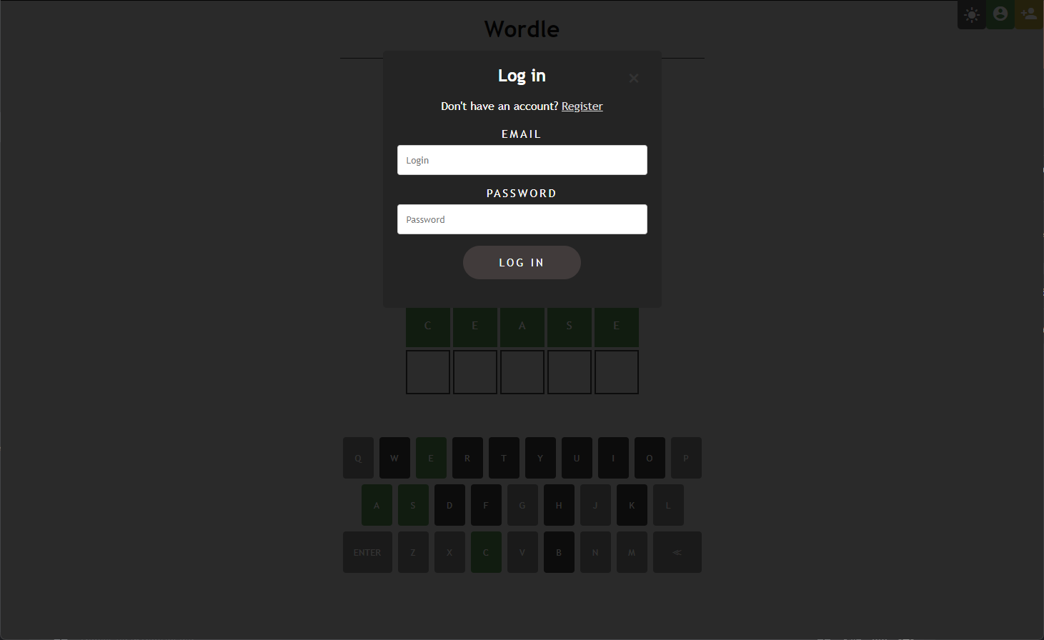 - The main section contains an area where the current state of the game will be displayed, i.e., guessing attempts and their results, as well as an auxiliary keyboard illustrating used letters.