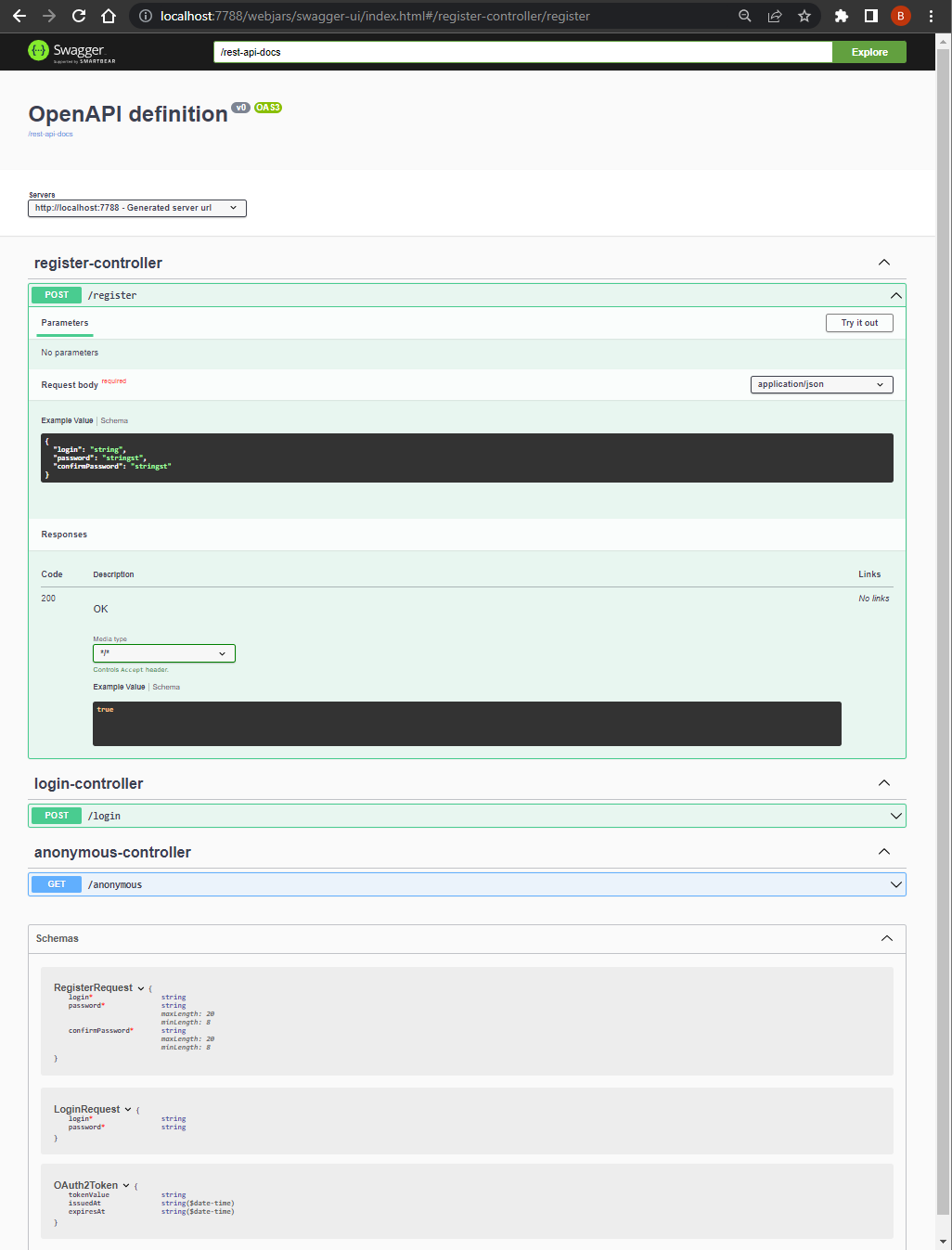 To facilitate testing of the service, we added a Swagger endpoint to the projects. It allows for easy invocation of endpoints without using external tools. After launching Docker, Swagger is accessible at the following addresses respectively: http://localhost:7777/swagger and http://localhost:7788/swagger