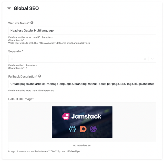 - 100% Headless: Define languages and translate pages, posts, slugs, SEO meta tags and PWA settings directly on DatoCMS.