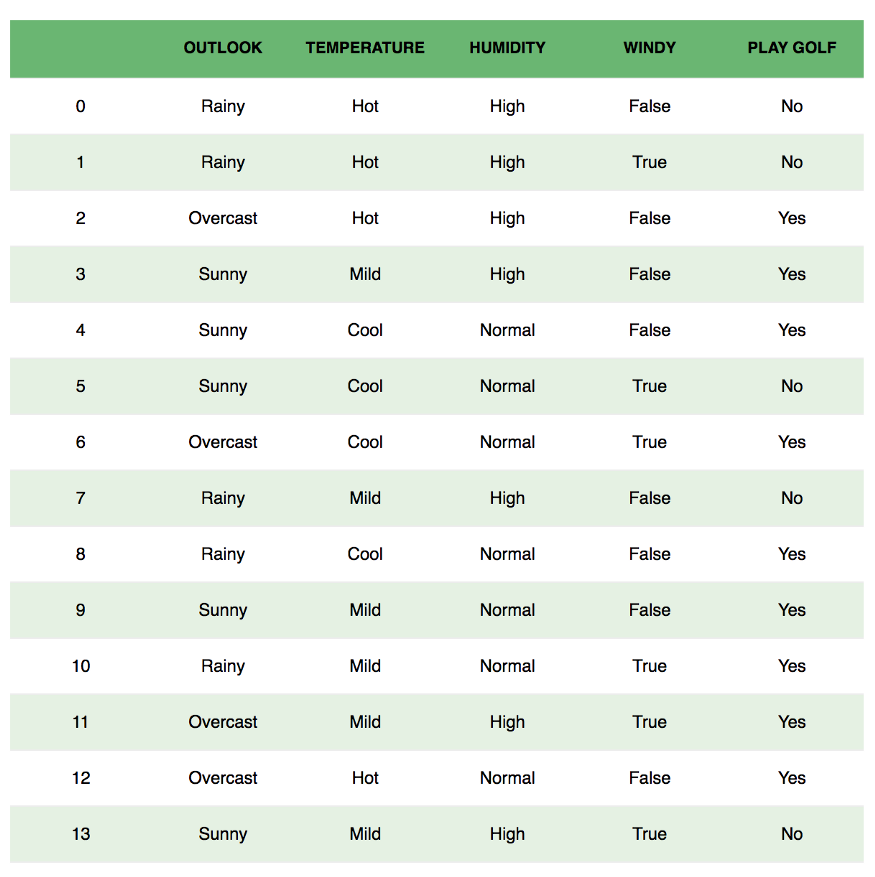 Let us take an example to get some better intuition. Consider the problem of playing golf. The dataset is represented as below.