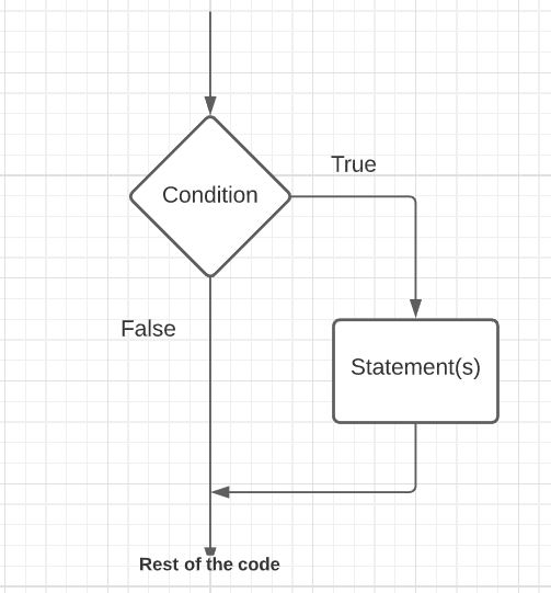 - If the boolean expression is not satisified i.e., false then it ignores the statements inside the conditional block and jumps to the next line in the code.