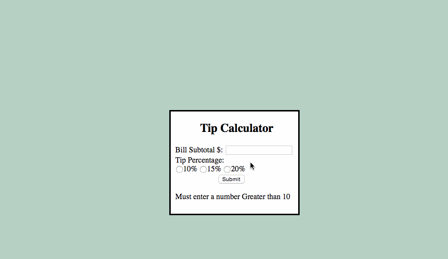 • User can enter a bill amount, choose a tip percentage, and submit the form to see the tip and total values.
