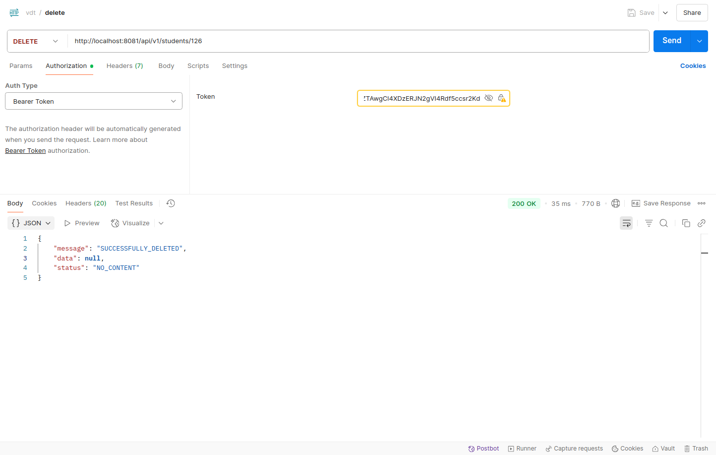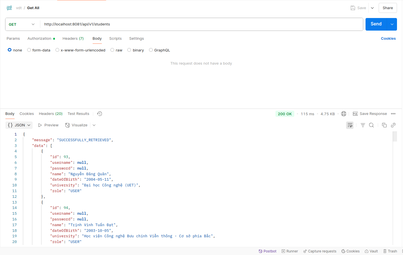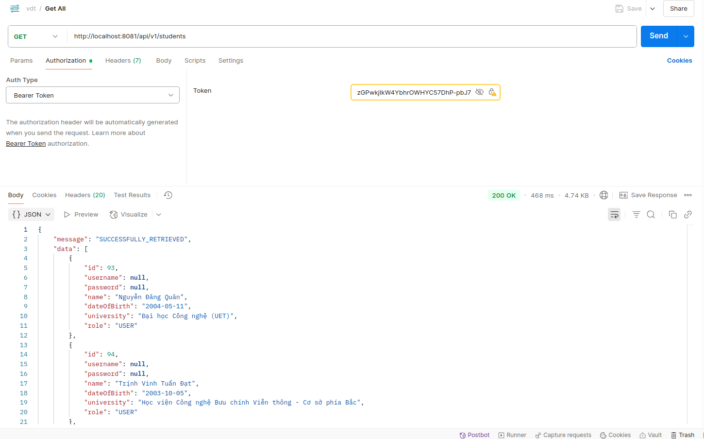 The API endpoint /api/v1/students allows clients to retrieve student records. To prevent abuse and overuse, a token bucket algorithm is used to limit the number of requests.