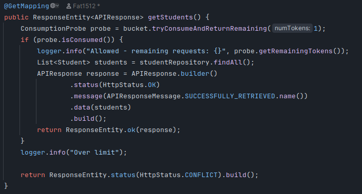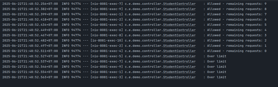 - Once all tokens are used, further requests are blocked until the bucket refills after 1 minute.