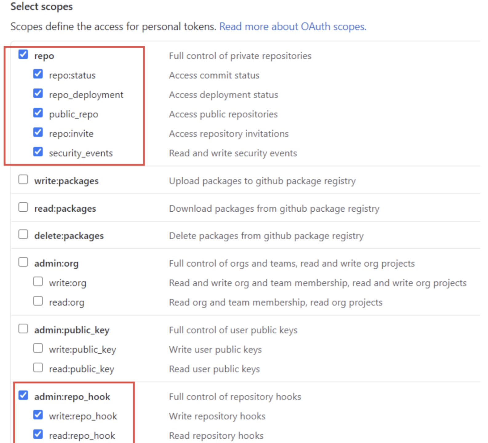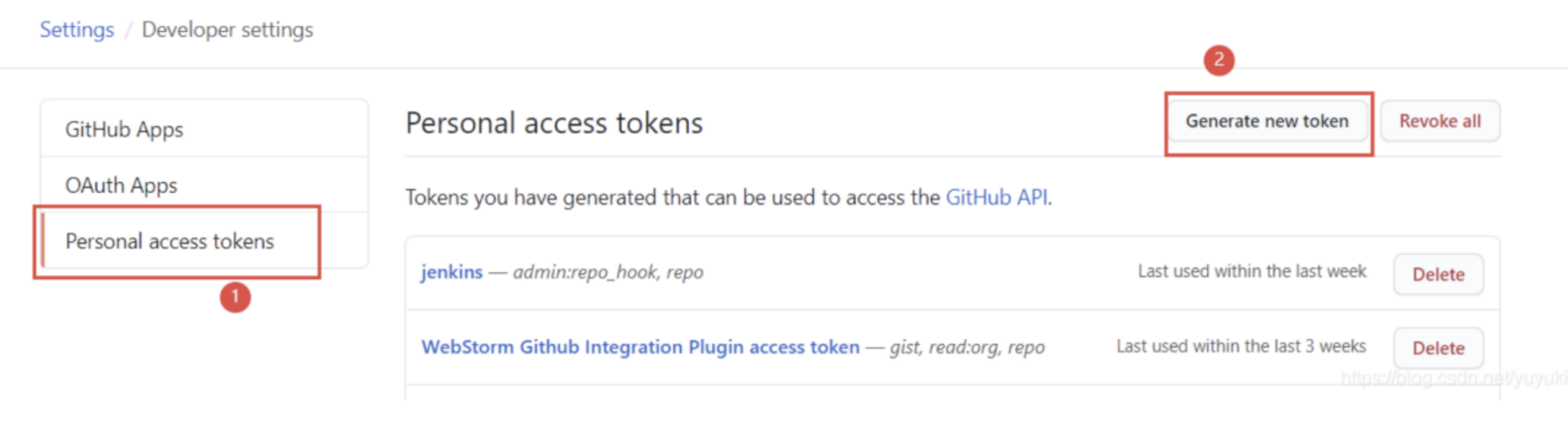 Settings->Developer settings->Personal access tokens->Generate new token- 然后对Note命名为jenkins,勾选下图两项