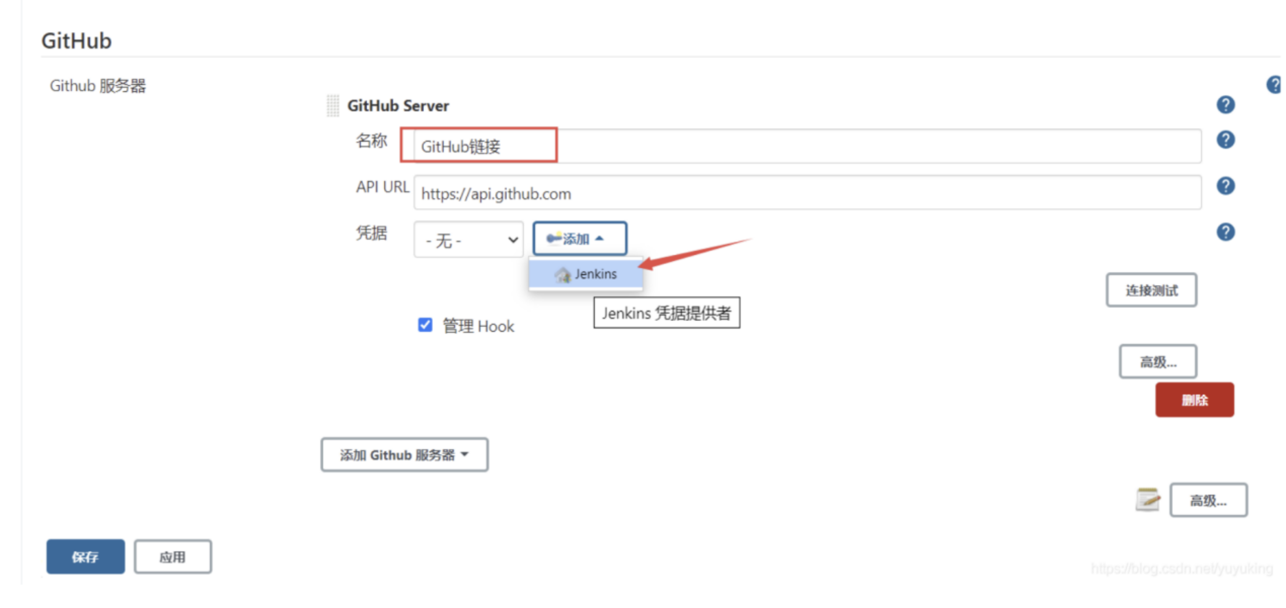 - 依次点击系统管理->系统设置,找到GitHub,添加GitHub服务器,其中API URL是固定的,输入名称,点击添加,添加一个凭据。