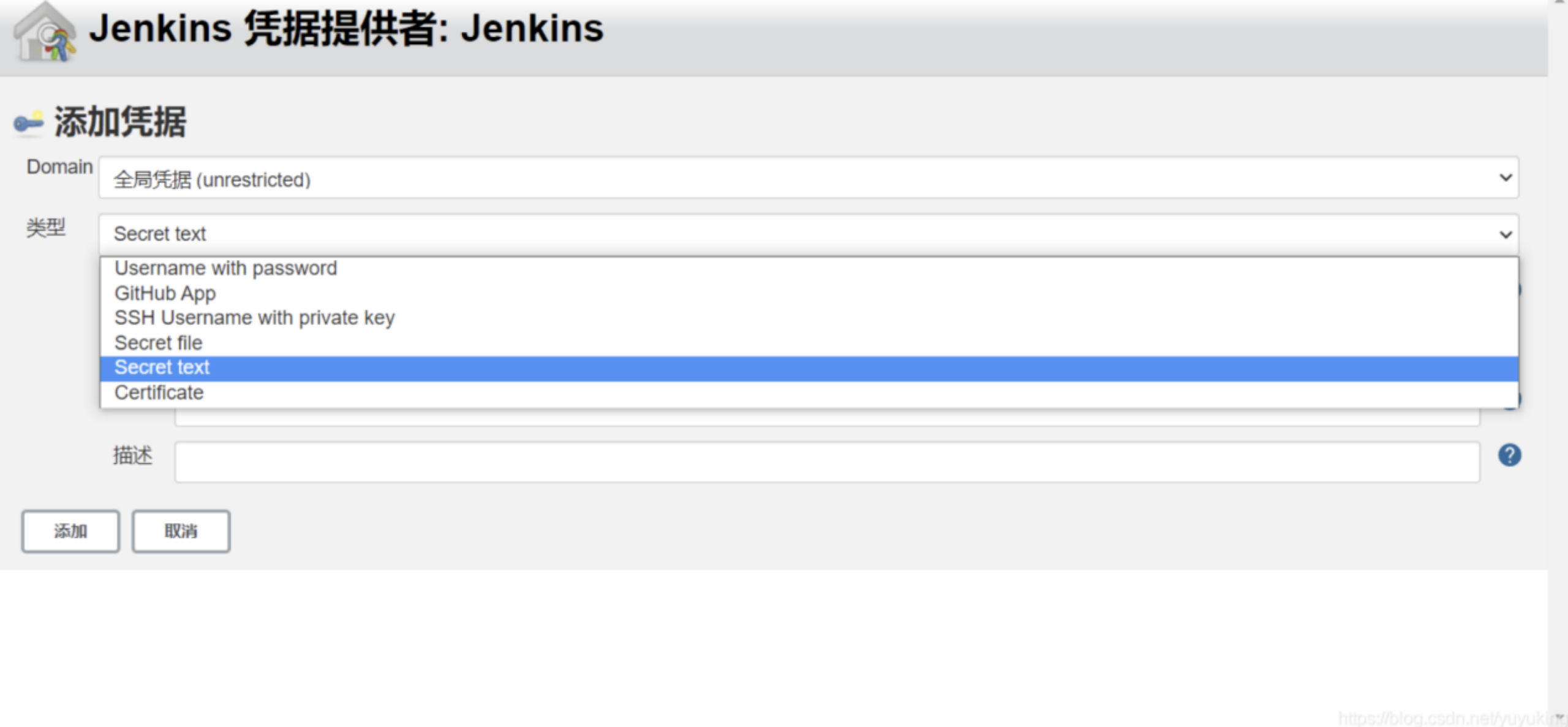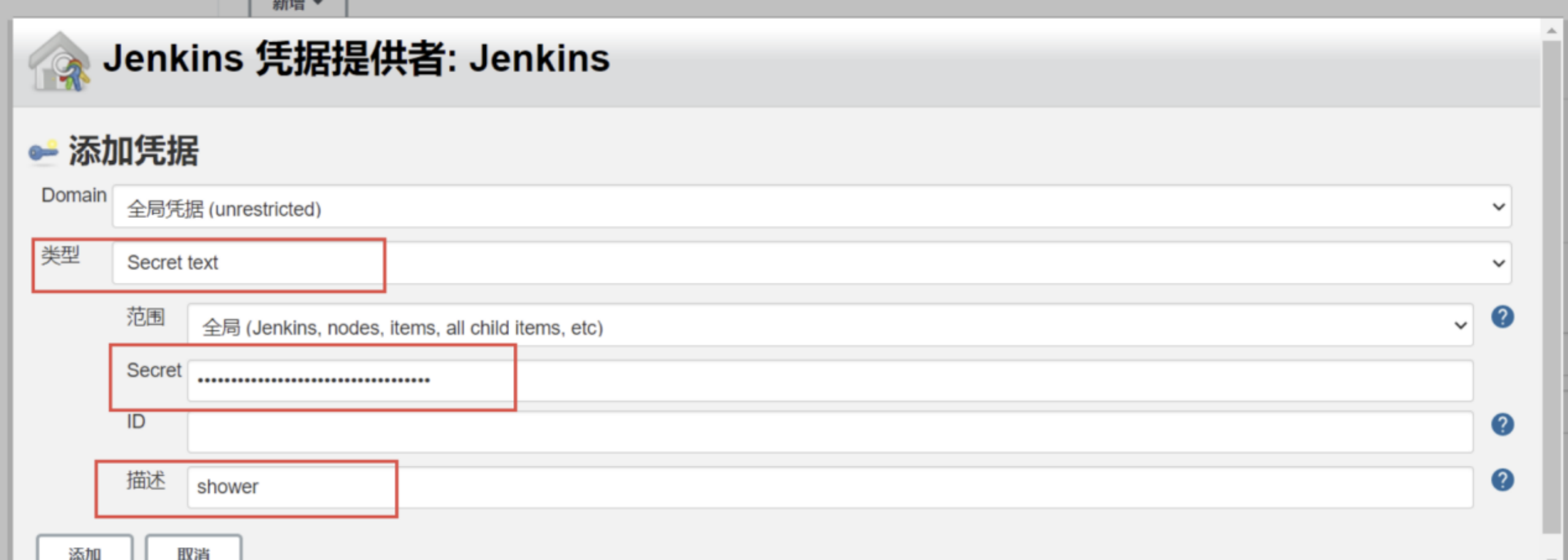 - 类型选择Secret text,Secret输入刚才复制的tonken,描述随意写,就是一个别名。