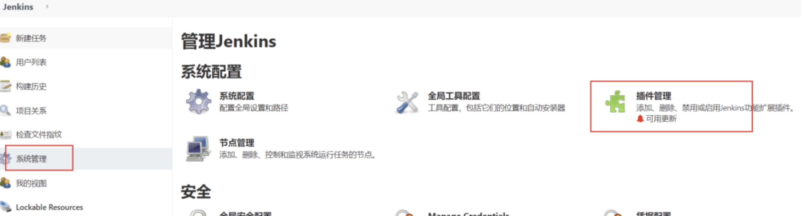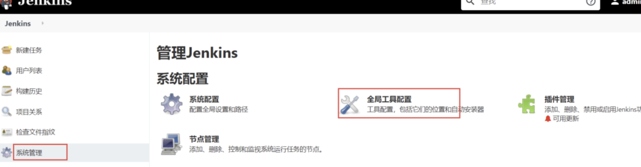 - 之后点击连接测试是否连接成功,上述安装步骤走完以后,我们就来安装我们所需要的一些插件,因为我们部署前端的项目是需要node环境的,所以我们要在jenkins的插件管理里安装一个nodejs插件 点击系统管理->插件管理