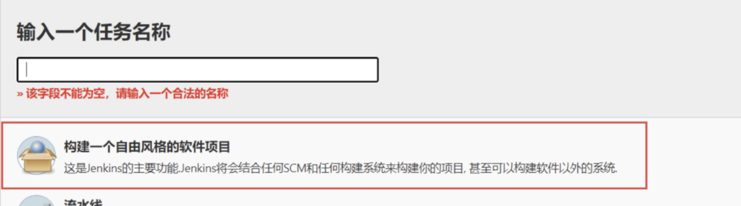 - 现在让我们来新建一个任务,输入名称,选择构建一个自由风格的软件项目