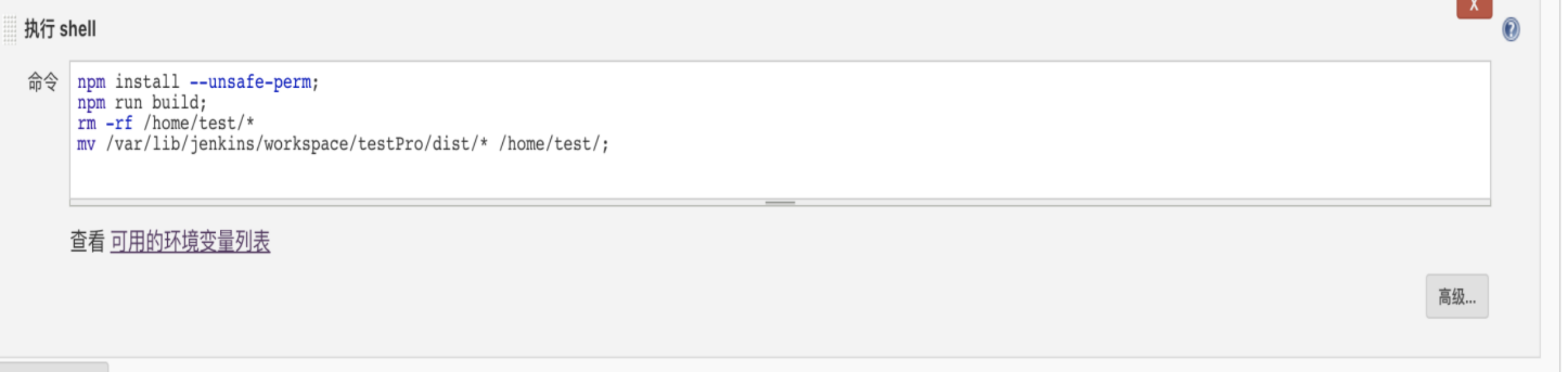 - 勾选之后修改shell命令,意思为打包后把dist文件夹移动到 /root/testweb/目录下,并更名为 jenkinsPro