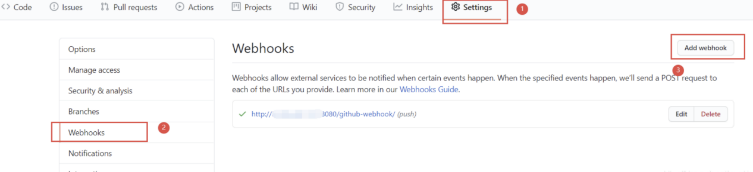 Settings->Webhooks->Add webhook- 输入的url为,其中/github-webhook/是固定的