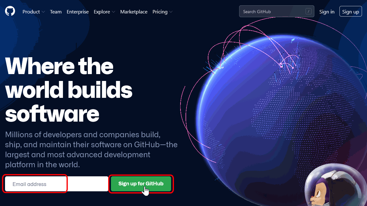 Para crear una cuenta, debes ir a la página oficial de Github donde colocaras tu correo y daras click en "Sign up for Github".
