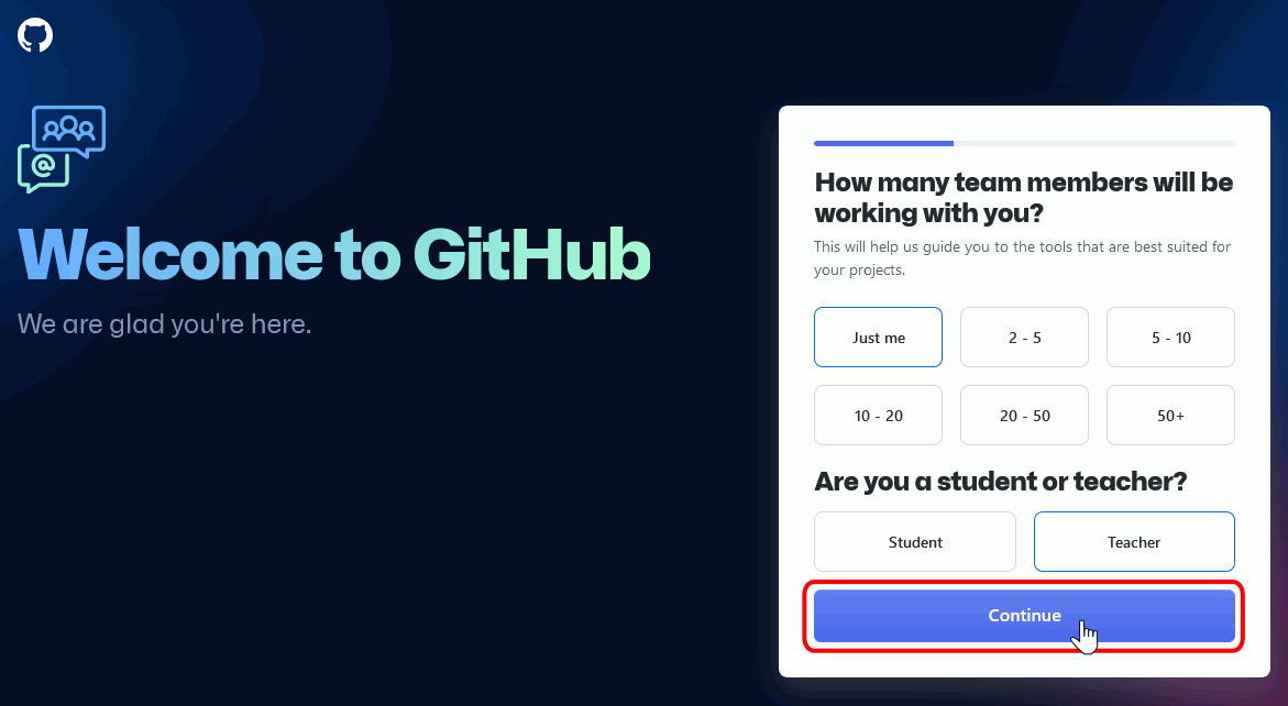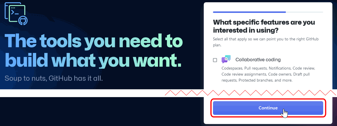Marcamos la casilla de collaboration coding y damos click en "Continue".
