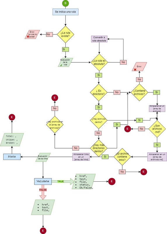 La idea inicial recibida para la creación del proyecto fue una librería que permitiera analizar el estado de links presentes en archivos .md Para esto se dibujó un diagrama de flujo que considerara los pasos y la lógica a seguir al ejecutar estos comandos aplicados tanto a archivos como directorios, generando recursividad en la función.