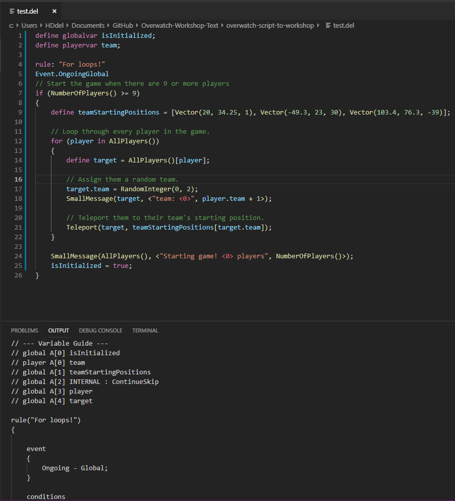 Deltin's Script To Workshop Create a script that will be converted to an Overwatch Workshop. Wiki Examples Lava: A collection of minigames including soccer, volleyball, and a randomly generated maze.