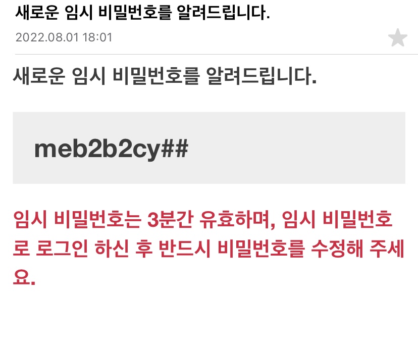 value: { 임시 발급된 비밀번호(3가지 조합 8자리 이상) }