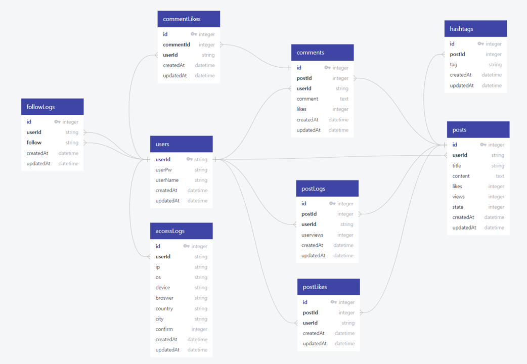 users유저 정보 저장 테이블posts게시글 저장 테이블hashtags해시태그 저장 테이블postLogs게시글 본 기록 저장 테이블postLikes게시글 좋아요 기록 저장 테이블accessLogs유저 웹 접근 기록 저장 테이블followLogs팔로우 기록 저장 테이블comments게시글 댓글 저장 테이블commentLikes게시글 좋아요 기록 저장 테이블