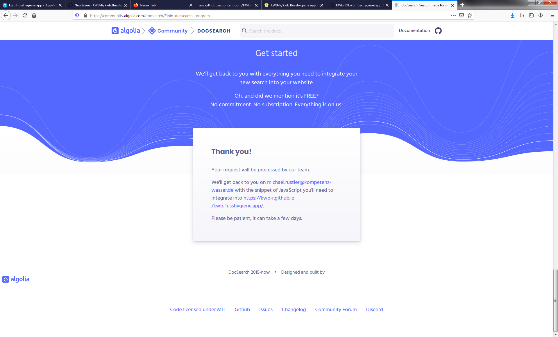 Application (https://community.algolia.com/docsearch/#join-docsearch-program ) completed: