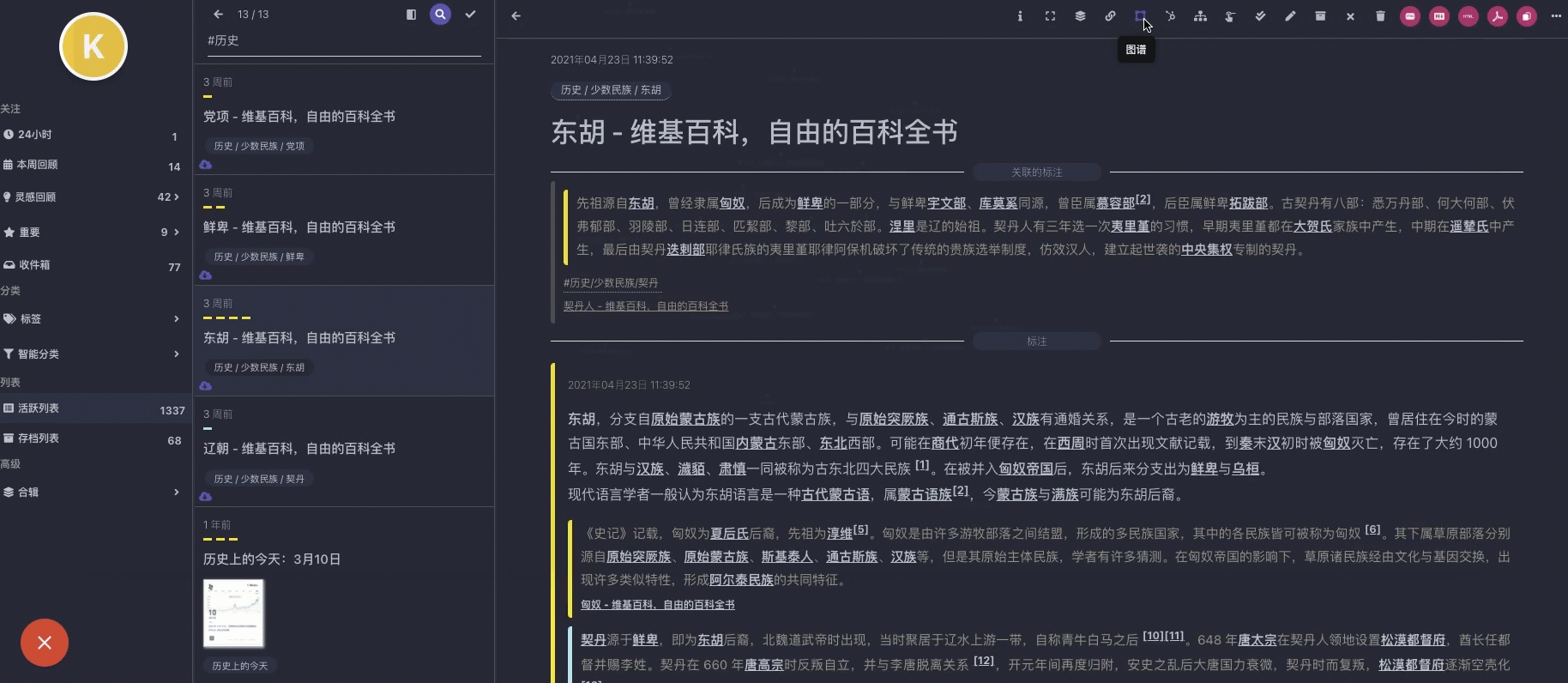 简悦的稍后读借鉴了 ZK 笔记法的一些特点,专门针对信息的整合增加了如下一些新功能: