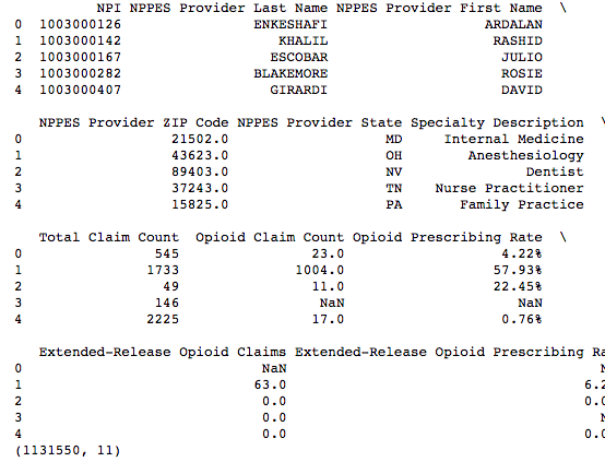 The dataset provider summary table contains the demographics of the individual prescribers (n=1,131,550). Briefly, it includes the National provider identification(NPI) number, name, gender, address, medical credential, specialty, and medicare enrolment status. It also includes the summary of the abstracted clinical data such as the number of total claims count from the prescriber, total opioid claim count based on the supply of all prescription drugs, total claims of antibiotic drugs, total claims of high-risk medication (HRM) drugs, total claims of antipsychotic drugs, and more importantly, the number of patients treated with opioid prescriptions, and the ratio of opioid prescription to non-opioid prescription.