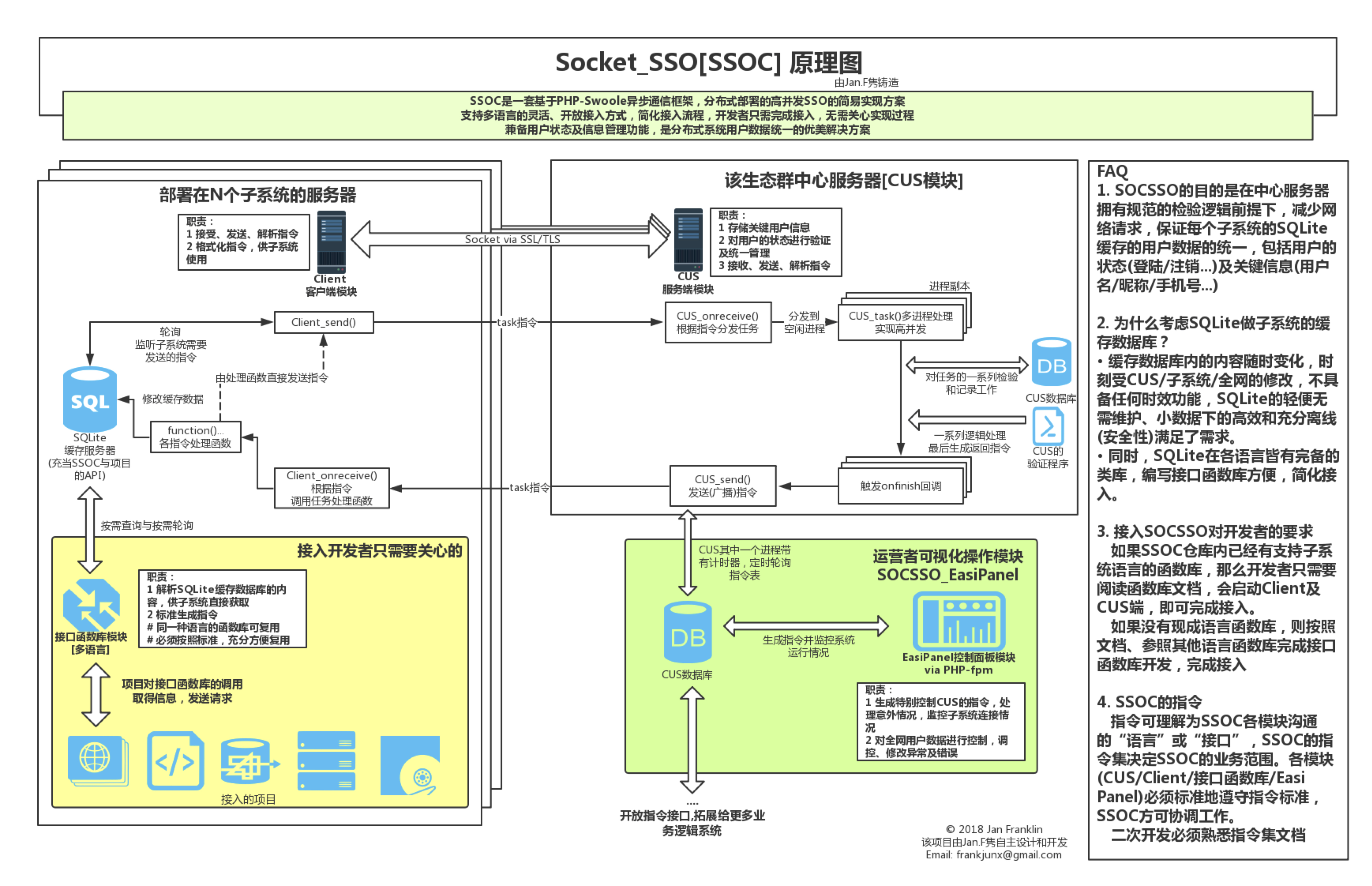 - Client 为客户端Client模块文件,管理与CUS的通信和指令的处理,子系统只需要运行于php-cli并简易配置就可轻松接入SOCSSO