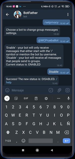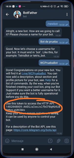 - Crear el bot entando a @BotFather y seguir los siguentes comandos