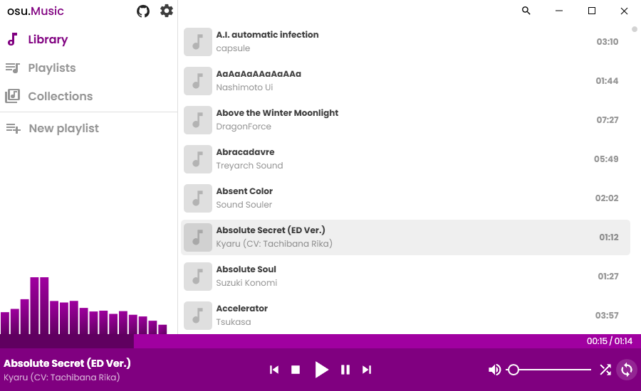 osu.Music is a simple music player for osu! players that want to access their beatmap library without launching the game. At the moment osu.Music supports most of the features needed for comfortable listening expirience.