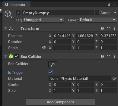 - 현재 Collision 이벤트가 아닌 Trigger에만 작동하므로 주의
