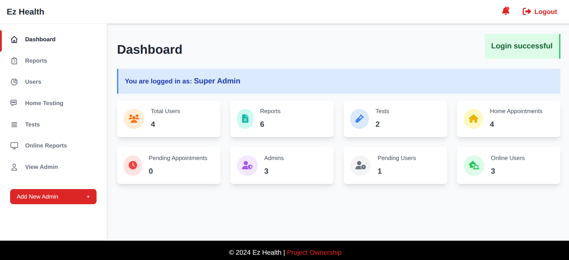 The Ez Health Admin Panel is your central command center for managing the entire Ez Health ecosystem. This powerful, web-based dashboard empowers administrators and healthcare staff to efficiently oversee users, appointments, reports, tests, and all critical system operations. Built with a modern tech stack, it guarantees real-time data handling, ironclad security, and a seamless, intuitive user experience.