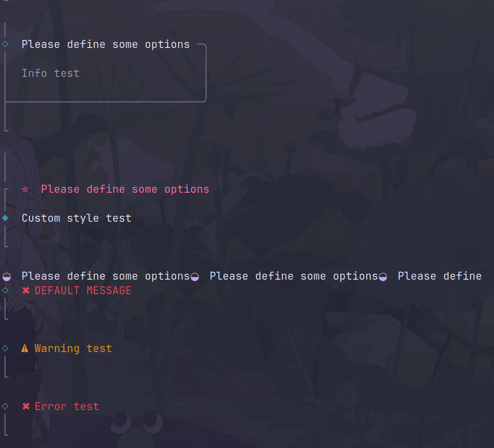});🎨 Custom colors and symbols 🌈 Powered by Clack for beautiful UI ⚡ Spinners and animations 🎯 TypeScript support 🔧 Cross-platform (Windows, MacOS, Linux)