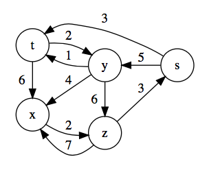 Run the Bellman-Ford algorithm on the directed graph below, using vertex z as the source. In each pass, relax edges in the order listing below, and show the d and π values after each pass. Now, change the weight of edge (z, x) to 4 and run the algorithm again, using s as the source.- (t, x), (t, y), (t, z), (x, t), (y, x), (y, z), (z, x), (z, s), (s, t), (s, y)