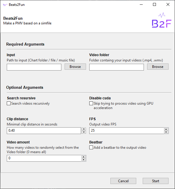 usage: Beats2Fun.py [-h] [-recurse] [-no_cuda] [-clip_dist Clip distance] [-fps FPS] [-num_vids Video amount]