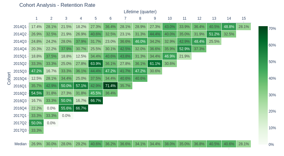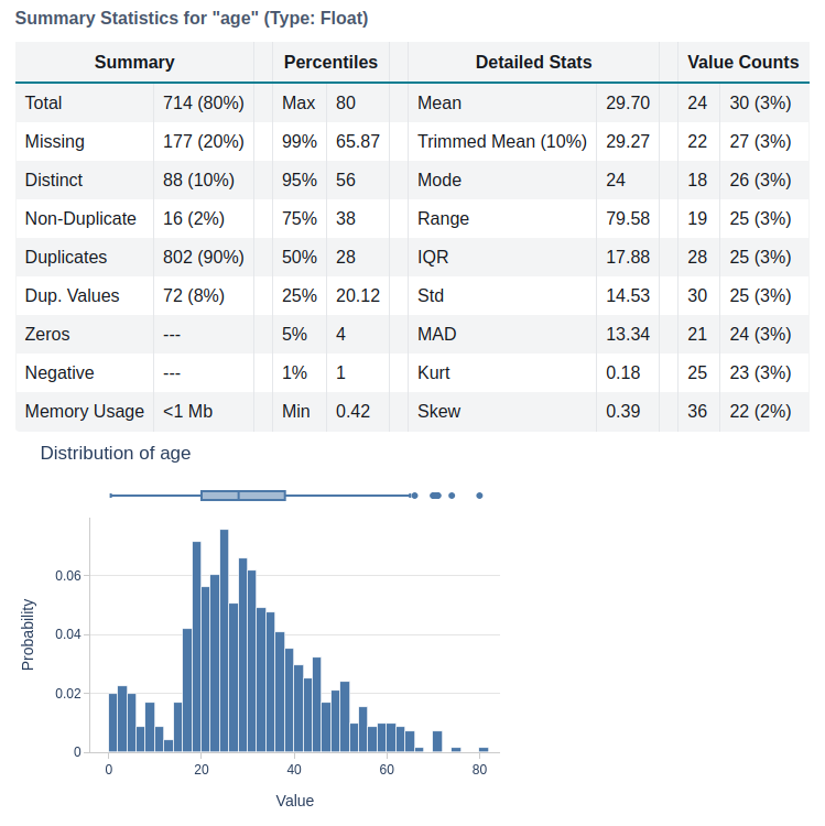 titanic['age'].explore.info()Quickly visualize user retention with a cohort heatmap: