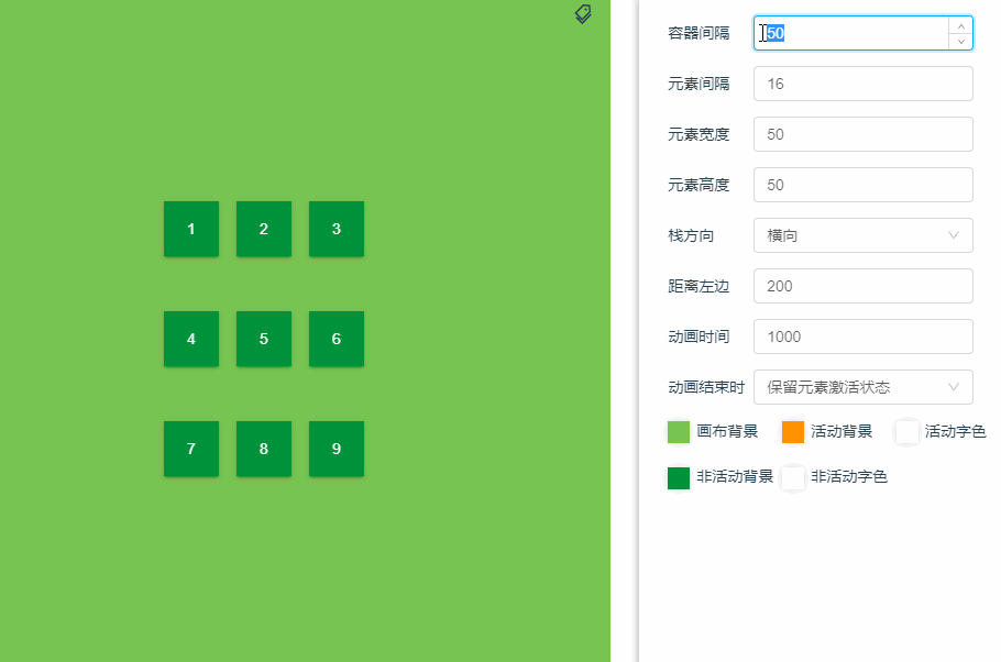 在配置面板,你可以自定义容器背景,元素背景,元素字体色,元素间隔,执行动画时间等。