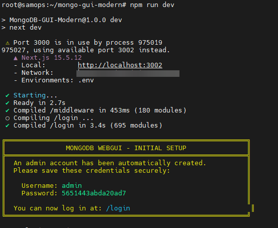http://localhost:3000. - Check your terminal: As soon as the page loads, a yellow box will appear in your console containing your auto-generated