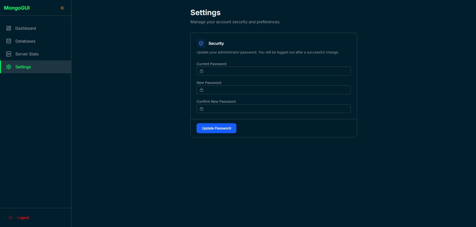 - User Settings: Update your administrator password directly from the interface.