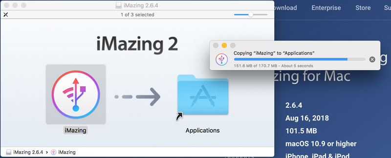First install iMazing. If you're on a Mac just drag the iMazing app to your Applications folder. If you're on a PC just click the installer and follow the on-screen instructions.