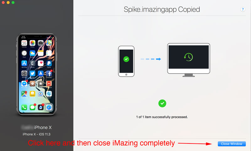 After the backup is finished just click "Close Window" and then close iMazing completely, we don't need it anymore. You can also uninstall it if you want. If you're on a Mac you can use the AppCleaner app to uninstall iMazing and the backup you just created so you can save some space on your hard disk drive https://freemacsoft.net/appcleaner/