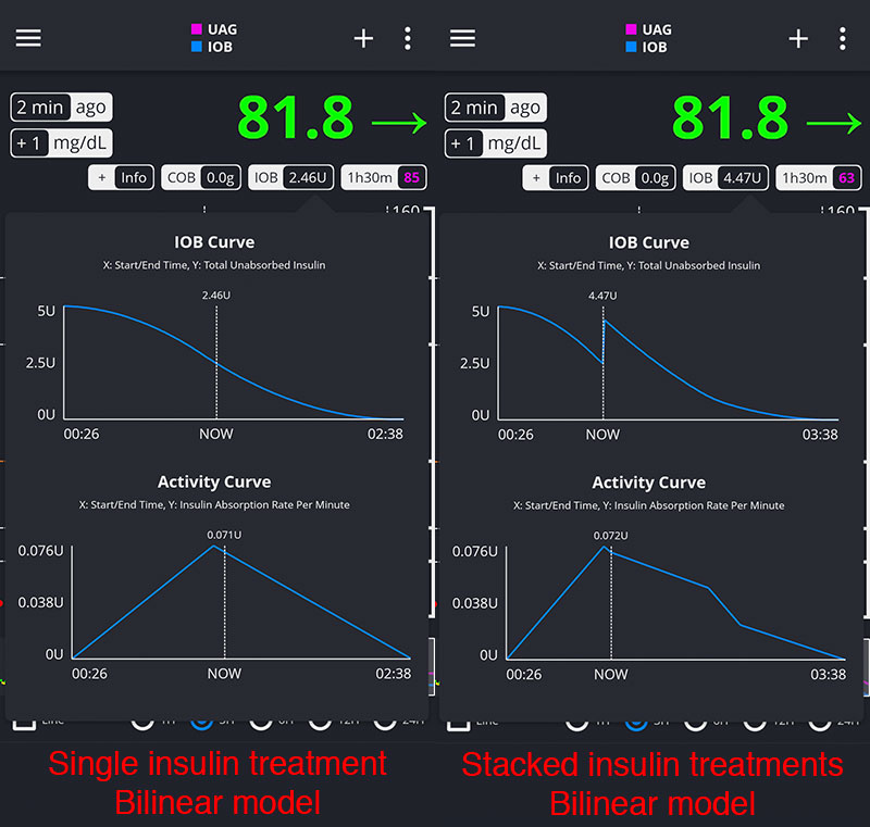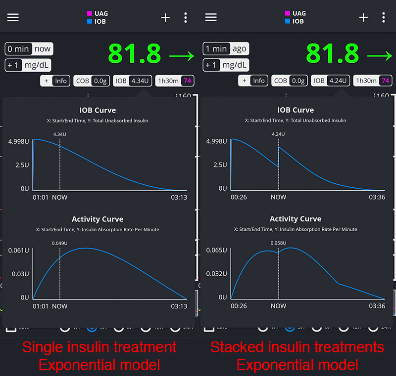 IOB: Represents how insulin is absorbed, over time (past present and future), by the body. This curve is also useful to determine at what exact point in the future all insulin will be fully absorbed.