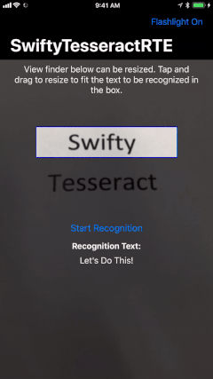 SwiftyTesseractRTE (SwiftyTesseract Real-Time Engine) is a real-time optical character recognition library built on top of SwiftyTesseract.