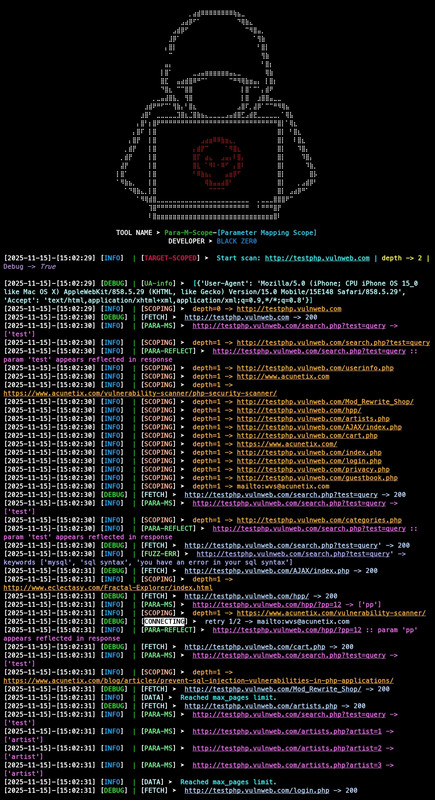 Para-M-Scope (Parameter Mapping Scope) is an asynchronous parameter discovery tool that crawls a target website and extracts parameterized URLs. It is fast, lightweight, and designed for recon and web application mapping in InfoSec workflows.
