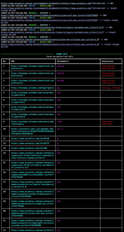 CLI table shows: index, URL, parameter names, and a quick suspicious indicator (reflection/fuzz hints included).