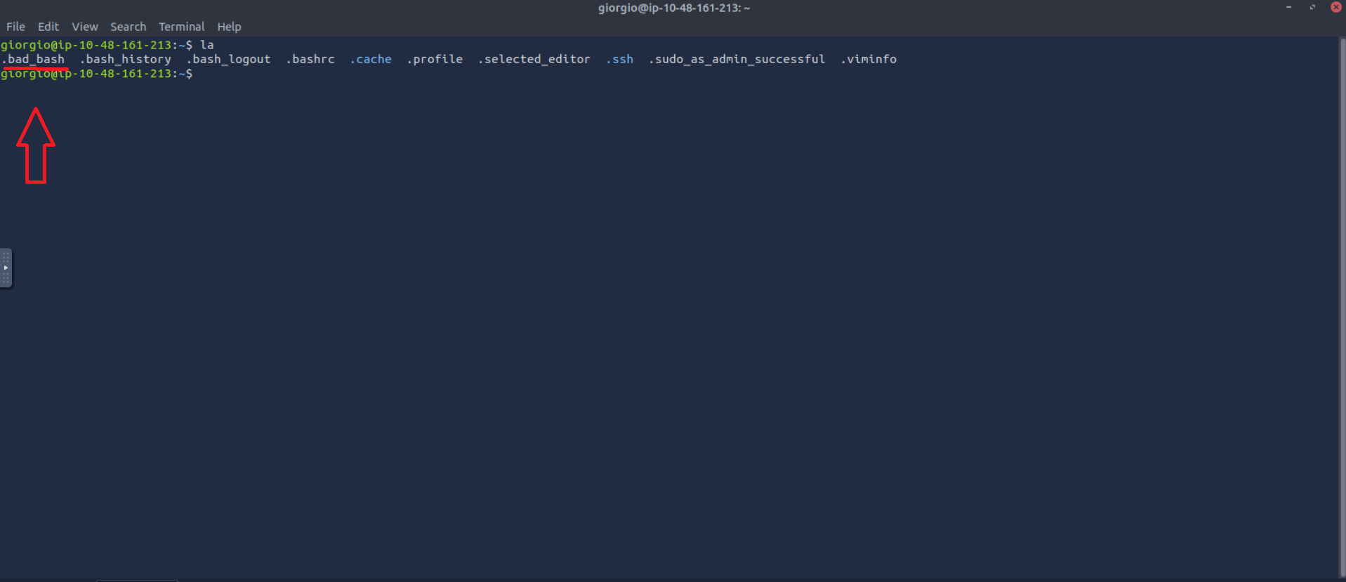The presence of a hidden file named .bad_bash in the user’s home directory is indicative of unauthorized modification. Hidden files with misleading names are commonly used by attackers to store malicious scripts or maintain persistence while avoiding casual detection.