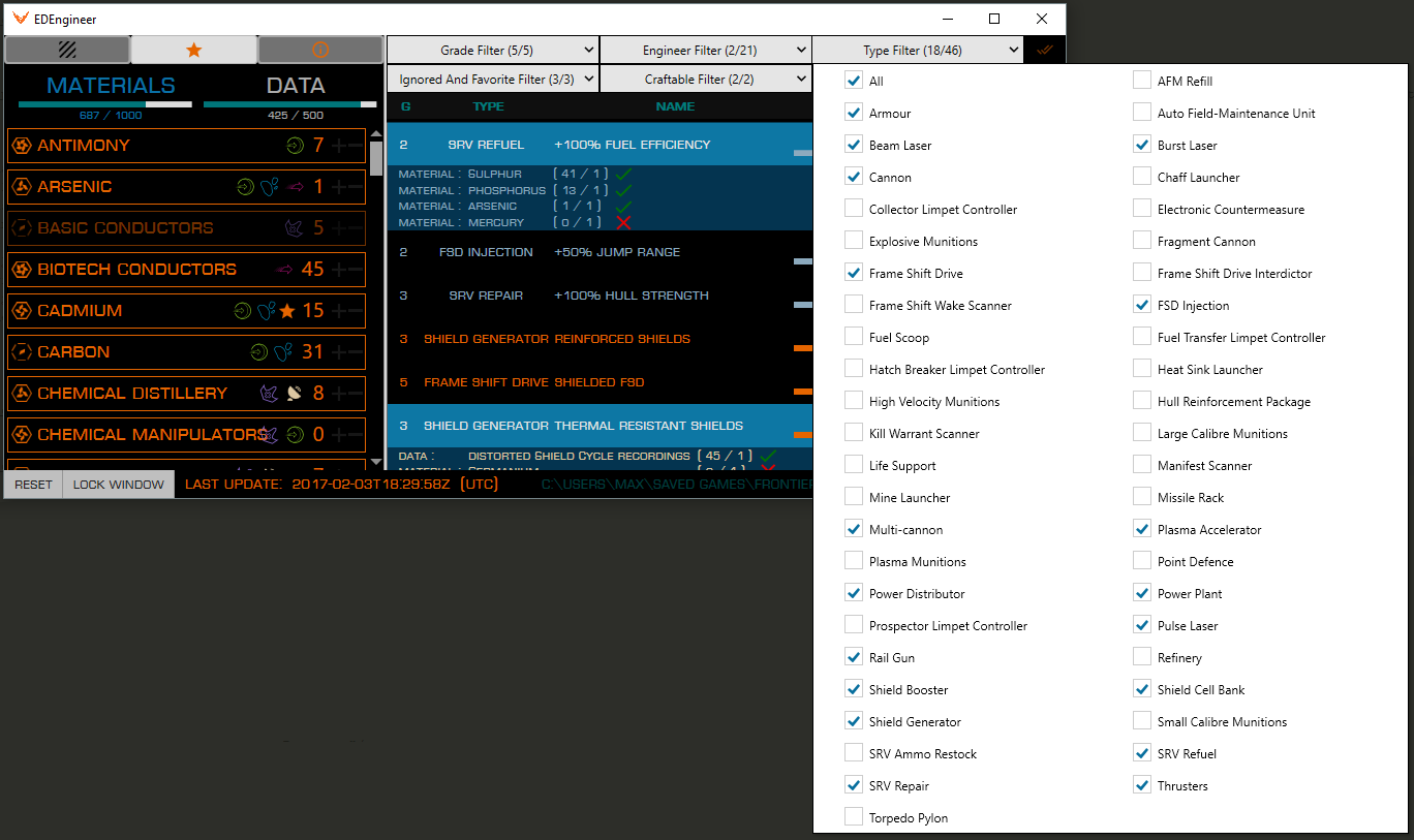 EDEngineer is a basic app I've written to track materials, data and cargo acquired in Elite Dangerous. That way, we can also track progress of blueprints available from the Engineers. Installer here.