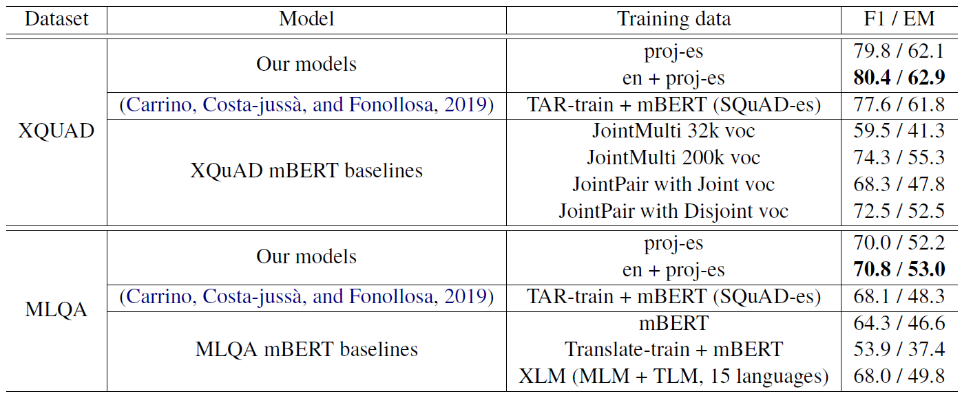 When used to train Multilingual BERT, the Spanish dataset achieves a new state of the art in the XQuAD and MLQA question-answering benchmarks.