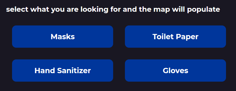 Pins can be added to the map, and specify whether hand sanitizer, masks, gloves, or toilet paper are in stock or out of stock. Pins are categorized as "Masks", "Gloves", "Hand Sanitizer" and "Toilet Paper". Pins are displayed for that category after pressing the corresponding button.